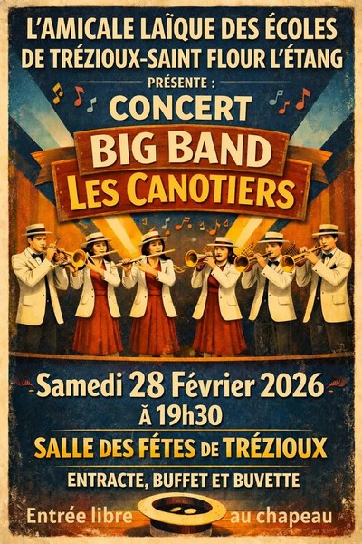 L'amicale laïque des écoles de Trézioux /Saint Flour-L'Étang a le plaisir de vous convier à un concert exceptionnel du Big Band “Les Canotiers” le samedi 28 février 2026 à 19h30 dans la Salle des Fêtes de Trézioux.