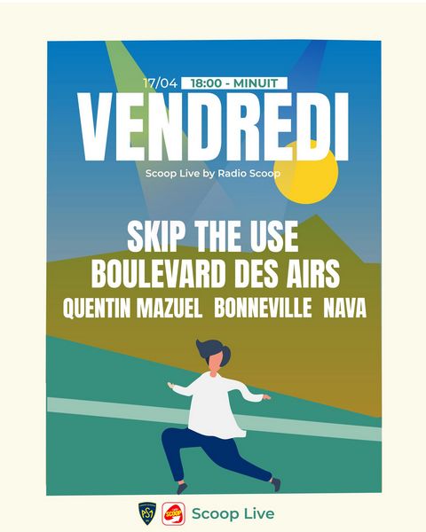 Programmation : 18h-20h DJ Quentin Mazuel - 20h15-20h40 Bonneville (Pop) - 20h40-21h00 Nava (Pop Rock) - 21h-21h15 Boulevard des Airs (Pop) - 21h25- 21h45 Skip the Use (Rock) - 22h-minuit DJ Quentin Mazuel