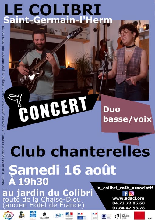 Avec Club Chanterelles : Un duo Basse/Voix plein de poésie, alternant douceur et dynamisme, tantôt francophone, tantôt anglophone et parfois brésilien.