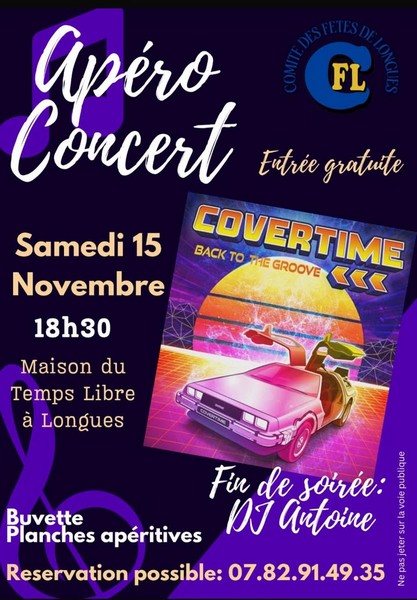 Le Comité des Fêtes de Longues vous attend pour son premier apéro concert! Covertime sera là pour un super concert, suivis de DJ Antoine pour animer la fin de soirée. Vous pourrez manger des planches apéritives (réservation possible) tout en profitant d'une super ambiance en compagnie de l'équipe du CFL!