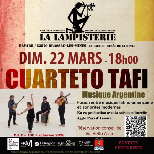 CUARTETO TAFI : C’est lors d’un voyage en Argentine, sur les terres colorées et arides du nord-ouest argentin, que ce quartette franco -argentin se retrouve pour la première fois. Autour de Leonor Harispe, chanteuse rayonnante avec une présence scénique remarquable, Ludovic Deny (Bouzouki), Matthieu Guenez (Guitare et Oud) et Frédéric Theiler (Percussions) s’imposent avec force sur ce 5 ème album irrésistiblement énergique et poétique.