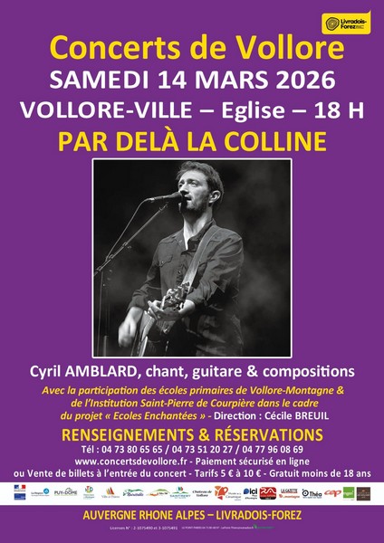 Dans le cadre de L’autre Saison 2025-2026 des Concerts de Vollore , nous vous invitons à partir à la découverte d’un projet artistique « Par delà la colline » avec Cyril Amblard chant & guitare accompagné par près de 100 jeunes choristes des écoles pour un spectacle unique, original et émouvant ! Le tout sous la direction de Cécile Breuil. Avec la participation des écoles de Vollore-Montagne et de l'Institution Saint-Pierre de Courpière.