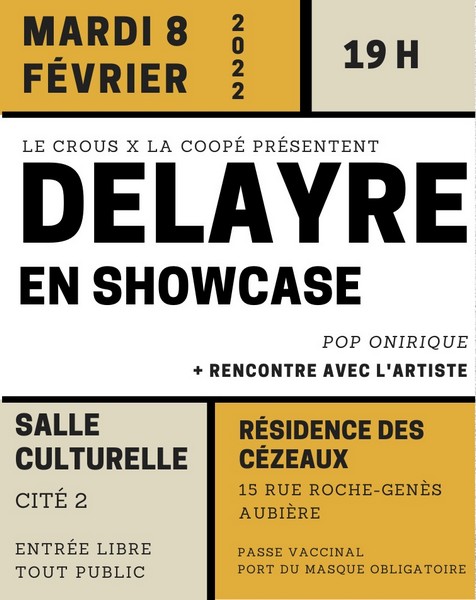 Le service culturel du Crous Clermont Auvergne et La Coopérative de Mai s’associent pour vous plonger dans la musique actuelle de la scène clermontoise. LES SHOWCASES : UNE OCCASION UNIQUE DE DÉCOUVRIR DES ARTISTES DANS UN CADRE INTIMISTE. Entrée gratuite et ouvert à tous Rencontre avec l'artiste à l’issue du concert