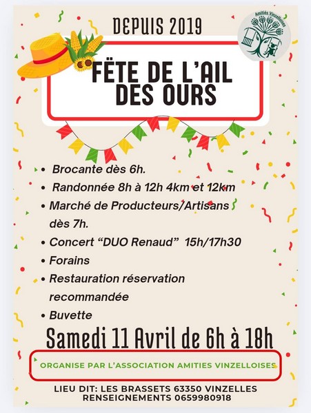 L’association Amitiés Vinzelloises vous donne rendez-vous pour célébrer la traditionnelle Fête de l’ail des ours à Vinzelles ! À cette occasion, venez profiter d’un moment convivial et festif avec la venue exceptionnelle du Duo Renaud