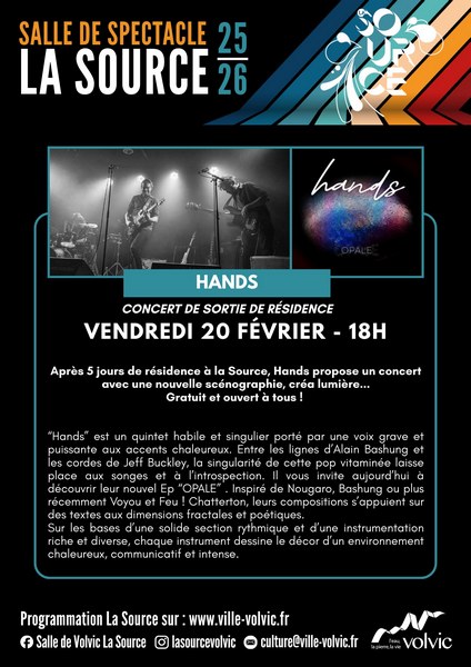 Sur les bases d’une solide section rythmique et d’une instrumentation riche et diverse, chaque instrument dessine le décor d’un environnement chaleureux, communicatif et intense. Après 5 jours de résidence à la Source, Hands propose un concert avec une nouvelle scénographie, créa lumière...