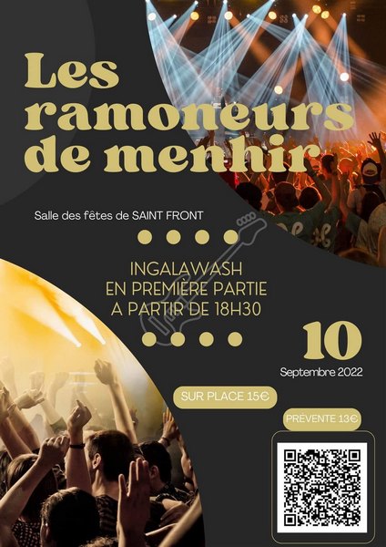 N'oubliez pas le Concert des Ramoneurs de Menhirs c'est le weekend prochain, à la salle des fêtes de Saint Front. Vous pouvez toujours prendre vos places en préventes à 13€.( Utilisez le QR code sur l'affiche ou sur le site hello asso ). Avec le Cdj de Saint-Front