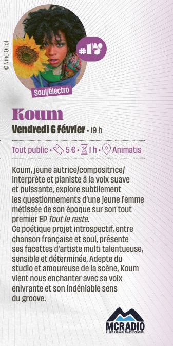 Koum, jeune autrice/compositrice/interprète et pianiste à la voix suave et puissante, explore subtilement les questionnements d’une jeune femme métissée de son époque sur son tout premier EP 'Tout le reste'. Ce poétique projet introspectif, entre chanson française et soul, présente ses facettes d’artiste multi talentueuse, sensible et déterminée. Adepte du studio et amoureuse de la scène, Koum vient nous enchanter avec sa voix enivrante et son indéniable sens du groove.