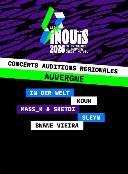 Parmi 90 candidatures, et à l’issue d’une journée d’écoute riche en échanges et débats, le jury des iNOUÏS du Printemps de Bourges/Crédit Mutuel a finalement retenu IN DER WELT (métal), KOUM (chanson), MASS-K & SKETDI (rap), SLEYN (rap) et SWANE VIEIRA (musiques électroniques). La suite ? Prochaine étape de fin janvier à fin février donc, pour les auditions sur scène des finales régionales dans toute la France, et verdict définitif en mars, pour savoir si l’une ou l’un de nos sélectionné(e)s montera sur les scènes du festival, au printemps 2026 !