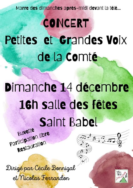 Il y aura de l'émotion à coup sûr pour ce concert qui réunira Petites et Grandes Voix de la Comté ! Plaisir de chanter ensemble et d'être dirigé par nos chefs adorés Cécile et Nicolas, puis moment convivial autour d'un verre... Tout sera réuni pour bien commencer cette période de fêtes