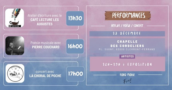 13h30 Atelier d’écriture - le Café lecture Les Augustes + 16h00 Poésie & Saxophone - Pierre Couchard + 17h00 Concert “La chorale de poche” éclectiques polyphonies