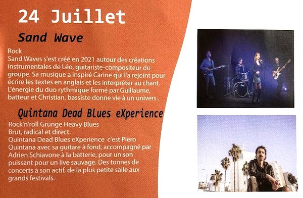 Sand Wave Rock : Sand Waves s'est créé en 2021 autour des créations instrumentales de Léo, guitariste-compositeur du groupe. Sa musique a inspiré Carine qui l'a rejoint pour écrire les textes en anglais et les interpréter au chant. L'énergie du duo rythmique formé par Guillaume, batteur et Christian, bassiste donne vie à un univers