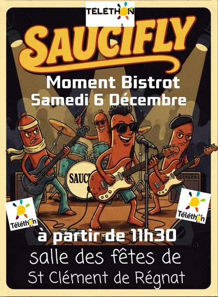 Salut les chorizettes! Saucifly joue pour la bonne cause... On se retrouve samedi à 11h30 à Saint Clément de Régnat pour le Téléthon! On compte sur vous (en plus y a tripes à manger!)